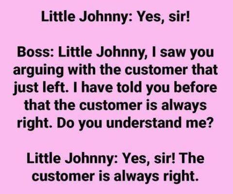 Boss: (Shouting) Little Johnny, come to my office immediately.Little Johnny: Yes, sir! Boss: Little Johnny, I noticed you arguing with the customer who just left. I’ve told you before that the customer is always right. Do you understand? Little Johnny: Yes, sir! The customer is always right. Boss: So, what were you arguing about with…