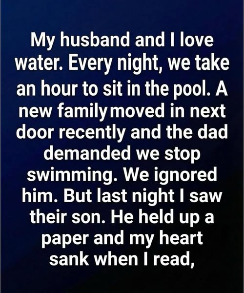 Our peaceful routine continued until new neighbors moved in next door. Initially, we shared polite greetings and exchanged smiles, but they appeared reserved and somewhat distant, which didn’t concern us. After all, everyone has their own backgrounds and stories, and we respected their space. However, just a few days later, we received an unexpected visit from the father of the family. His demeanor was tense, and his request was direct: he asked us to stop using the pool at night.