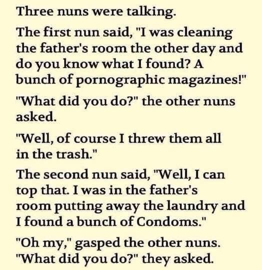 Three nuns were talking. The first nun said, “I was cleaning the father’s room the other day and do you know what I found? A bunch of porn0graphic magazines!” “What did you do?” the other nuns asked….