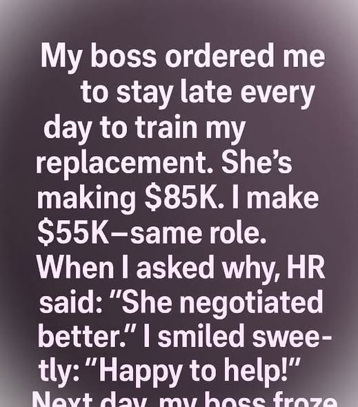 I suspected something was wrong the moment my boss asked me to stay late all week to train the woman hired to take over my job. The request felt too rushed, too rehearsed, and too convenient. A few days later, HR confirmed what I already sensed: my replacement would earn $85,000 while I had been making $55,000 for the same position. The explanation was blunt—“She negotiated better.” I didn’t argue. I didn’t even raise my voice. What I felt instead was a strange sense of clarity, like something had finally snapped into focus after years of ignoring the signs.
