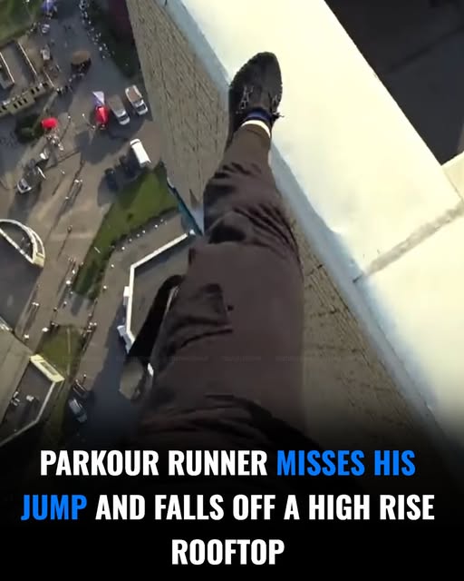 One parkour performer misjudged his jump and landed directly on a rooftop of a tall building.