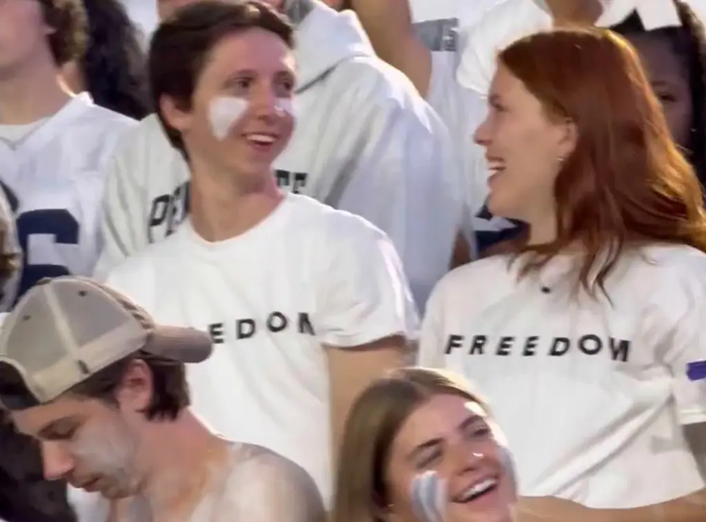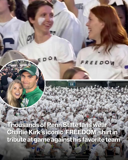 A number of Penn State football fans were seen wearing Charlie Kirk’s “FREEDOM” T-shirts at Saturday night’s game against Oregon.