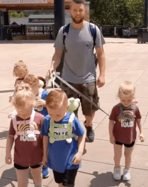 For the Driskells, outings with all five kids were both exciting and daunting. Initially using a six-seater stroller, they later switched to using leashes to ensure the safety and security of their children while out and about.